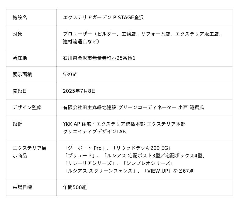 YKK AP株式会社(本社:東京都千代田区、社長:魚津 彰)は、プロユーザー向けに建物と外構のトータルコーディネイト提案を行う屋外提案施設「エクステリアガーデン」をP-STAGE金沢(※1)内に、7月8日に開設しました。エクステリアガーデンでは大型商品を実物大で確認が可能で、シーン展示による外構・庭空間を体感いただける施設です。エクステリア商品と植栽の融合を体感できる場として、外構・庭空間による住宅への付加価値提案を推進します。