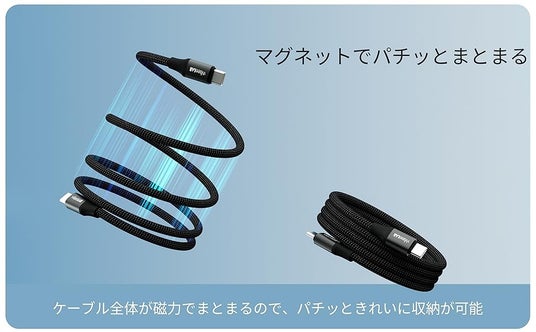 ケーブルが勝手に巻きつくような構造で、収納時に絡みにくく整理整頓もラク。取り回ししやすい1m仕様で、デスクや出張時の使用に最適です。