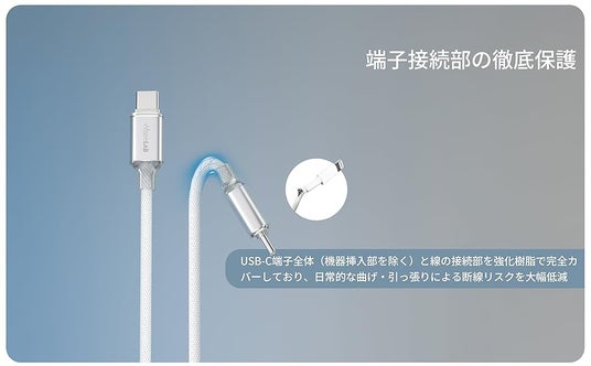 「根元から壊れる」というケーブルあるあるに真っ向から挑んだ、高耐久タイプ。やや長めの1.2mで、ソファーやベッド周りの充電でも取り回し良好です。