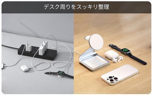 同時充電×省スペース×高級感のあるシルバーデザインが特徴。デスクやナイトスタンドに調和する上品な佇まいで、ケーブルの煩わしさから解放されたい方におすすめの据え置き型3in1充電ステーションです。