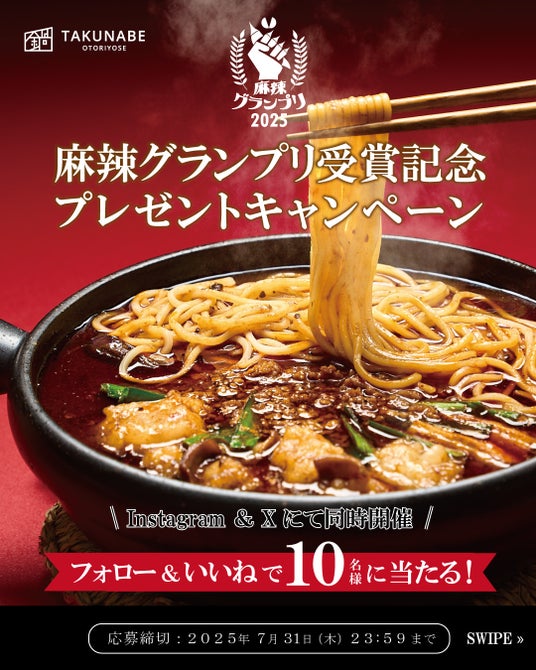 TAKUNABE公式Instagram&Xにて同時開催麻辣グランプリ2025受賞記念として「本格四川 痺れる辛さの麻婆もつ鍋」を10名様に当たるプレゼントキャンペーンを開催中です。