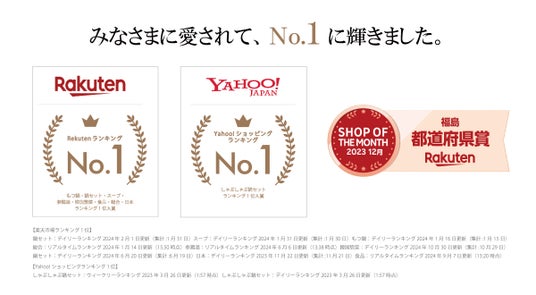 楽天市場やYahoo!ショッピングおいて、もつ鍋・参鶏湯・しゃぶしゃぶの各ランキング1位を獲得。また、楽天市場に出店する約57,000店の中からお客様の評価を元に選出される2023年12月の月間MVP「楽天ショップ・オブ・ザ・マンス」都道府県賞を受賞。