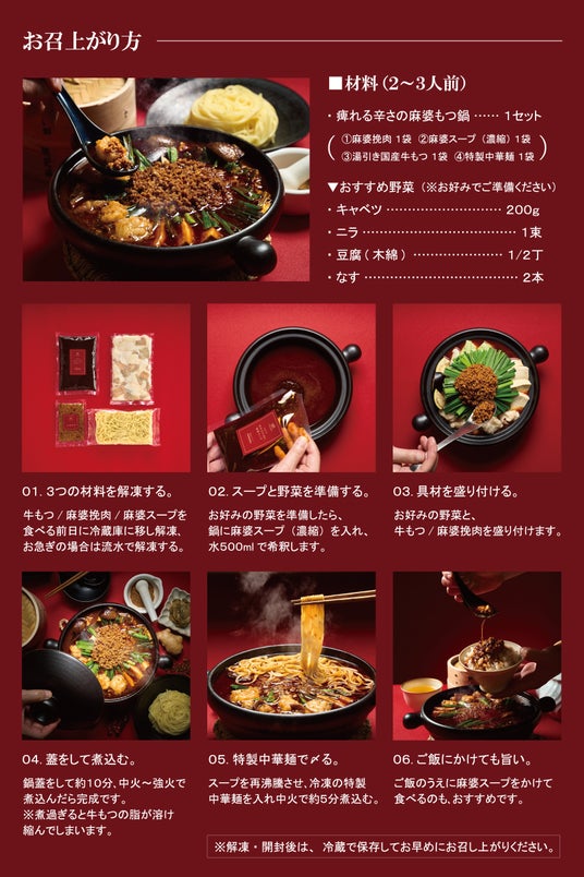 麻婆もつ鍋を楽しんだ後は、茹でたてそのまま瞬間冷凍したコシが強い特製中華麺を入れて、麻婆ラーメンとして鍋の〆をお楽しみいただけます。