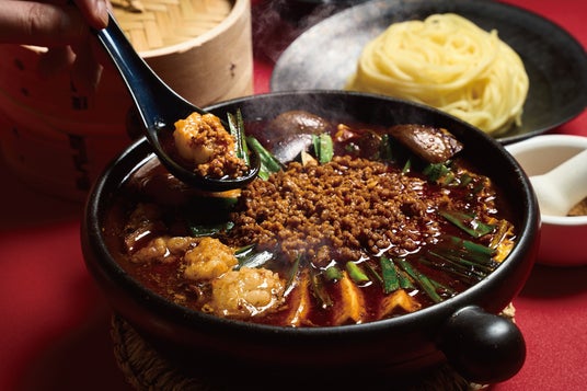 熟成された唐辛子の辛み、発汗作用のある中国・四川花椒(ホアジャオ)の痺れ、丁寧に独自の下処理を施した国産牛小腸100%の牛もつの甘みと、コクのある麻婆スープが織りなす"麻婆豆腐”と”もつ鍋”が融合した新感覚の「麻婆もつ鍋」です。