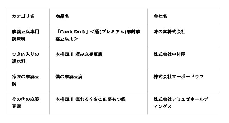 麻辣グランプリ2025では4カテゴリ【麻婆豆腐専用調味料】【ひき肉入りの調味料】【冷凍の麻婆豆腐】【その他の麻婆豆腐商品】ごとにグランプリ商品が決定し、下記の結果となりました。