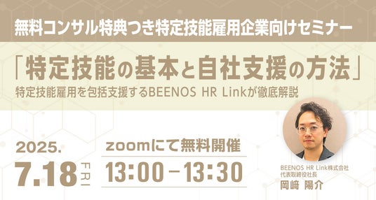 BEENOS株式会社(東証プライム:3328)の連結子会社で、特定技能雇用を包括支援するBEENOS HR Link株式会社(以下「BEENOS HR Link」)は特定技能の受け入れ企業に向けて特定技能の基本と自社支援の方法についてご紹介する無料セミナーを7月18日(金)に開催いたします。