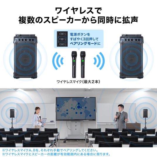 ワイヤレスマイクの音声を、同時に複数台のスピーカーから出力できます。スピーカー同士はワイヤレスで接続できます。