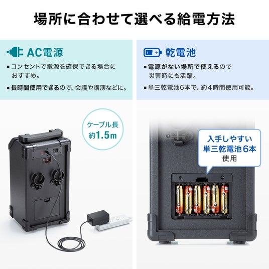通常の家庭用コンセントで使用できるAC電源と、電源のない場所でも使える乾電池駆動(単三乾電池×6本)の2通りの電源方式に対応します。