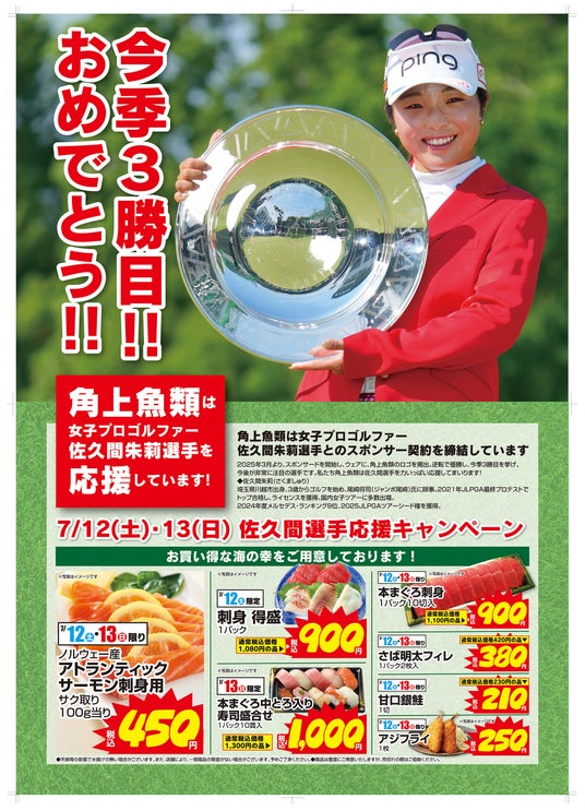 佐久間朱莉プロV3達成記念!夢の年間女王へ、角上魚類が全力応援!あの人気商品が7月12日・13日の2日間限定で特別価格になる、応援特売キャンペーン開催