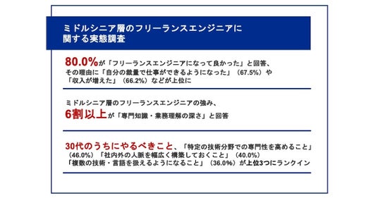 今回の調査では、ミドルシニア層のフリーランスエンジニアの業務やキャリアにおける価値観が明らかになりました。