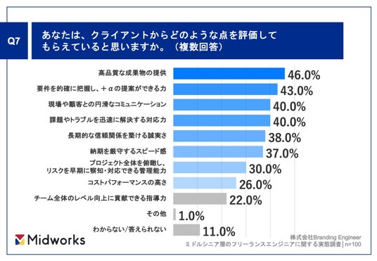 「Q7.あなたは、クライアントからどのような点を評価してもらえていると思いますか。(複数回答)」(n=100)と質問したところ、「高品質な成果物の提供」が46.0%、「要件を的確に把握し、+αの提案ができる力」が43.0%、「現場や顧客との円滑なコミュニケーション」が40.0%という回答となりました。
