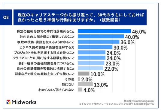 「Q8.現在のキャリアステージから振り返って、30代のうちにしておけば良かったと思う準備や行動はありますか。(複数回答)」(n=100)と質問したところ、「特定の技術分野での専門性を高めること」が46.0%、「社内外の人脈を幅広く構築しておくこと」が40.0%、「複数の技術・言語を扱えるようになること」が36.0%という回答となりました。