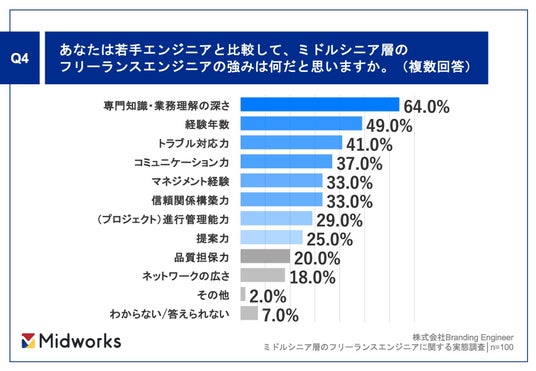 「Q4.あなたは若手エンジニアと比較して、ミドルシニア層のフリーランスエンジニアの強みは何だと思いますか。(複数回答)」(n=100)と質問したところ、「専門知識・業務理解の深さ」が64.0%、「経験年数」が49.0%、「トラブル対応力」が41.0%という回答となりました。