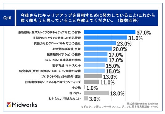 「Q10.今後さらにキャリアアップを目指すために努力していること/これから取り組もうと思っていることを教えてください。(複数回答)」(n=100)と質問したところ、「最新技術(生成AI・クラウドネイティブなど)の習得」が37.0%、「長期的なキャリアを意識した自己管理」が31.0%、「英語力などグローバル対応力の強化」が23.0%という回答となりました。