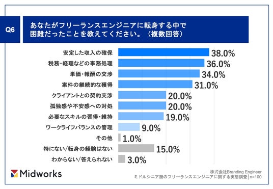 「Q6.あなたがフリーランスエンジニアに転身する中で困難だったことを教えてください。(複数回答)」(n=100)と質問したところ、「安定した収入の確保」が38.0%、「税務・経理などの事務処理」が36.0%、「単価・報酬の交渉」が34.0%という回答となりました。