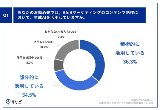 「Q1.あなたのお勤め先では、BtoBマーケティングのコンテンツ制作において、生成AIを活用していますか。」(n=328)と質問したところ、「積極的に活用している」が36.3%、「部分的に活用している」が34.5%という回答となりました。