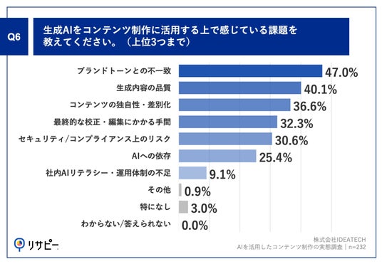 Q1で「積極的に活用している」「部分的に活用している」と回答した方に、「Q6.生成AIをコンテンツ制作に活用する上で感じている課題を教えてください。(上位3つまで)」(n=232)と質問したところ、「ブランドトーンとの不一致」が47.0%、「生成内容の品質」が40.1%、「コンテンツの独自性・差別化」が36.6%という回答となりました。