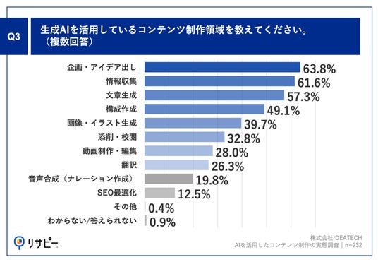 Q1で「積極的に活用している」「部分的に活用している」と回答した方に、「Q3.生成AIを活用しているコンテンツ制作領域を教えてください。(複数回答)」(n=232)と質問したところ、「企画・アイデア出し」が63.8%、「情報収集」が61.6%、「文章生成」が57.3%という回答となりました。