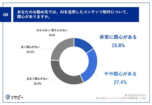 Q1で「活用を検討中である」「活用していない」と回答した方に、「Q8.あなたのお勤め先では、AIを活用したコンテンツ制作について、関心がありますか。」(n=95)と質問したところ、「非常に関心がある」が15.8% 、「やや関心がある」が27.4% という回答となりました。