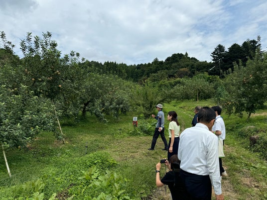 本製品の開発は大河原町の職員から「町で唯一の果樹園が大量の規格外りんごの廃棄で悩んでいるので何とかできないか」と紹介していただいたことから始まりました。その後、現地に視察に行き、状況を確認した上で、こうとくとふじの規格外品を当社が買い取り、100%のジュースを開発しました。