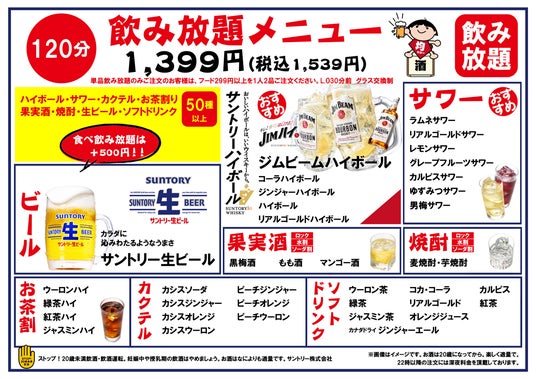 予約不要・当日注文OKの、大人気・食べ飲み放題メニュー