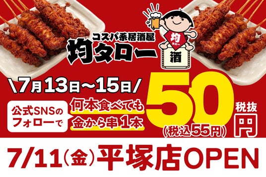 平塚店の新規開店を記念し7月13日(日)より3日間、名物「金から串」を1本50円(税込55円)のオープニングキャンペーンを開催します。コスパよく豊富なメニューを楽しめる、いつもの日常がもっと楽しくなる激安コスパ系居酒屋・均タロー 平塚店へぜひお越しください!