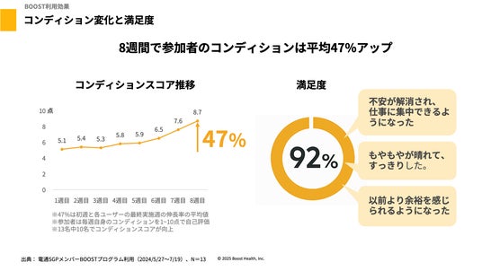 異動直後など環境変化によってプレッシャーやストレスを感じやすい状況にいるメンバーを対象とし、2か月間のBOOSTプログラムを実施。参加者の満足度は92%、コンディションスコアは平均47%改善という結果となりました。