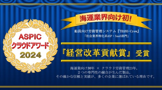 【ASPICクラウドアワード2024】船員向け労務管理システム『TRANS-Crew』経営改革貢献賞受賞
