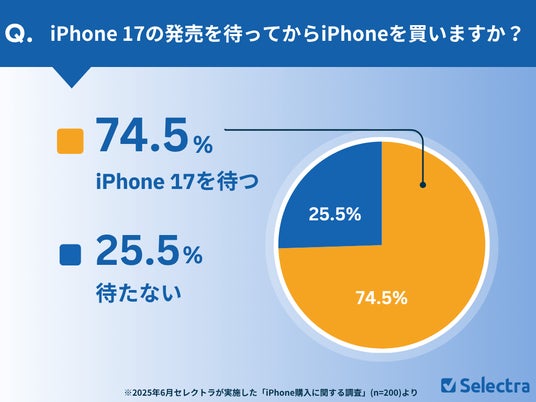 セレクトラ・ジャパン株式会社(本社:東京都渋谷区、代表取締役:グザビエ・ピノン)は、これから半年以内にiPhoneの購入を検討している男女200名を対象に、2025年9月に発売が噂されるiPhone 17の発売を待ってから購入するかどうか、アンケート調査を実施しました。