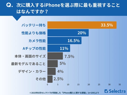 「次に購入するiPhoneでは何を最も重視しますか?」という質問に対しては、最多の33.5%が「バッテリー持ち」と回答しました。次いで、「価格」が20%、そして「カメラ性能」が16.5%という結果でした。