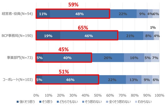 さらに、自社のBCPが機能するかどうかという回答を役職別に見ると、経営者・役員は59%、BCP事務局は65%が「機能する」と答えている一方で事業部門は45%と、役職や部門ごとに大きな実感の差があることがわかりました。