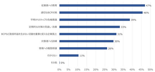 「有事に適切に動けるBCPに必要なもの」を尋ねた設問では、全体としては「従業員のへの教育」、「適切なBCP対策」、「平時からのトップの危機意識」という回答が上位にあがりました。