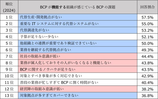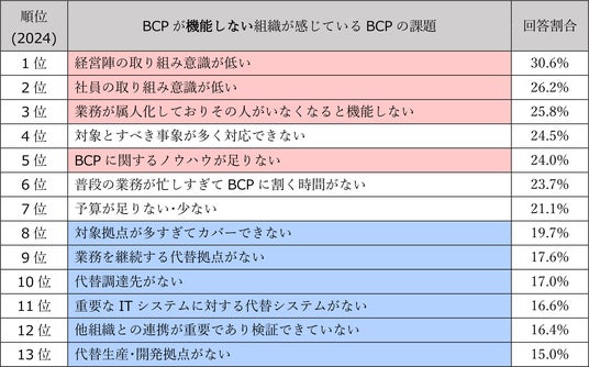 BCPが機能しない組織では「経営陣の取り組み意識が低い」、「社員の取り組み意識が低い」などヒトに関する課題が上位を占め、BCPが機能する組織では「代替生産・開発拠点がない」「重要なITシステムに対する代替システムがない」といったモノに関する課題が上位を占めています。