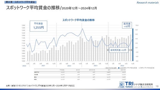 2024年12月度のスポットワーク平均賃金は1,255円。前月差+47円、前年差+53円となりました。通常のアルバイト平均賃金は1,219円で(※リクルート発表「アルバイト・パート募集時平均時給調査」)スポットワーク平均賃金との比較では、スポットワークが36円高いという結果になっています。