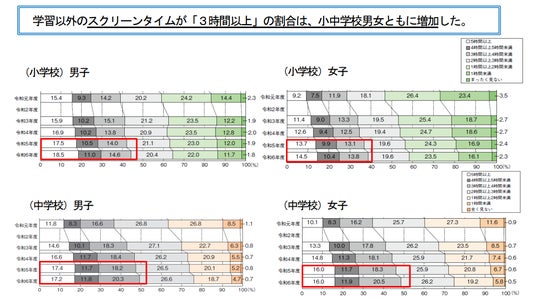 近年、小学生の体力低下と集中力の低下が深刻化しています。スポーツ庁が発表した最新の体力調査結果によると、小学校男子および中学校女子の体力合計点は前年度からほぼ横ばい、小学校女子に至っては引き続き低下しています。また、学習以外のスクリーンタイムが「3時間以上」の割合は小中学校男女ともに増加しており、運動不足が子どもたちの体力低下の大きな要因となっていることが示されています。