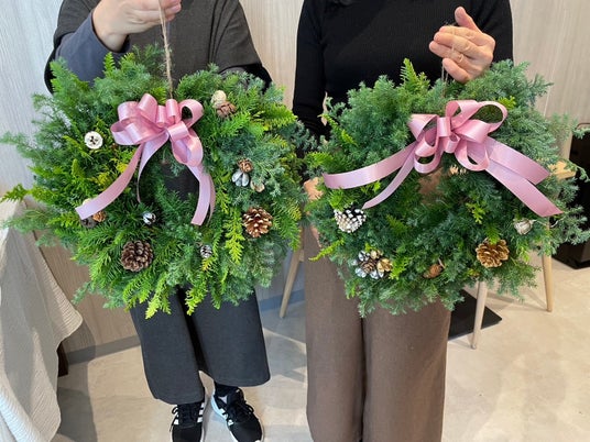桜十字の美花隊(園芸)指導のもと、ピンクのリボンをあしらったオリジナルのクリスマスリース作りが体験ができるワークショップを12月に開催しました。リース作りを楽しみながら、乳がんについてカジュアルにスタッフに相談することもできると好評でした。