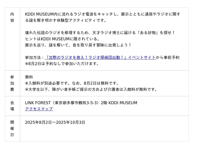 KDDIは2025年8月2日から10月3日まで、日本の国際通信の歴史に関する企業ミュージアム「KDDI MUSEUM」(所在地:東京都多摩市)において、謎解きプログラム「沈黙のラジオを救え!ラジオ探偵団出動!」(以下、本イベント)を開催します。KDDI MUSEUM内に流れるラジオ電波をキャッチし、展示とともに謎を解き明かす体験型アクティビティです。