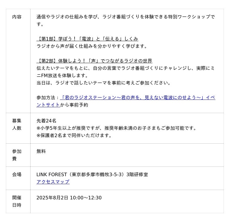 また、初日の2025年8月2日は無料見学日とし、子どもたちの夏休みの自由研究にも最適なラジオ番組づくりを体験できるワークショップや、無料で射的ゲームや輪投げなどの縁日が楽しめる夏祭りイベントを開催します。