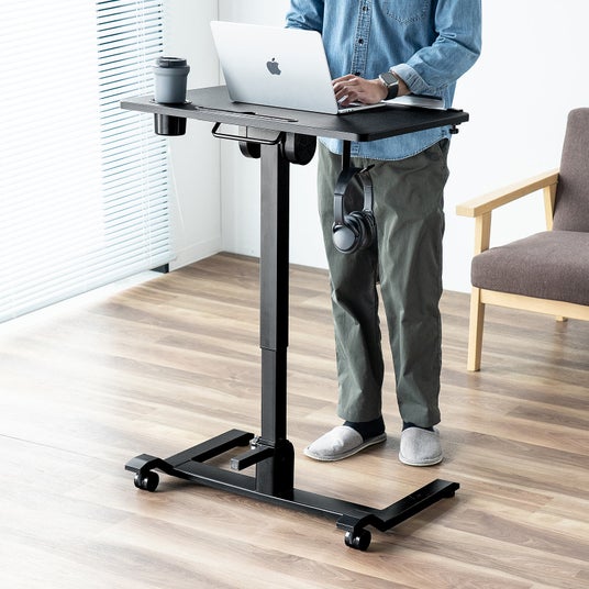 スタンディングデスク 昇降デスク ガス圧デスク 折りたたみテーブル 落下防止ストッパー 天板角度調整可能 無段階調節 カップホルダー フック付き ブラック