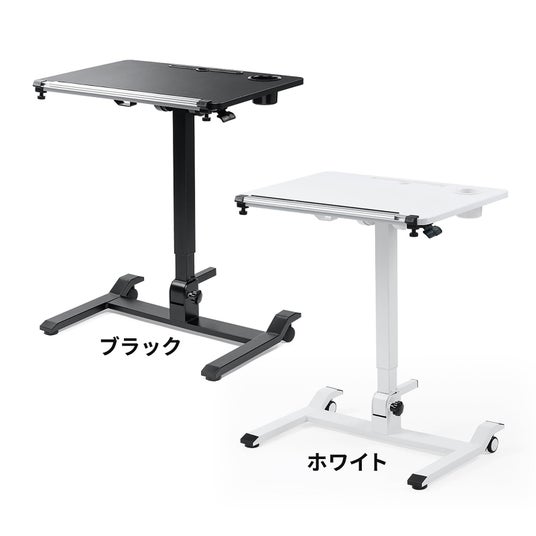 軽い力で調整できるガス圧式の昇降デスク。高さは109.5~75.1cmの間で調整ができ、角度も作業に合わせて無段階で調整ができます。
