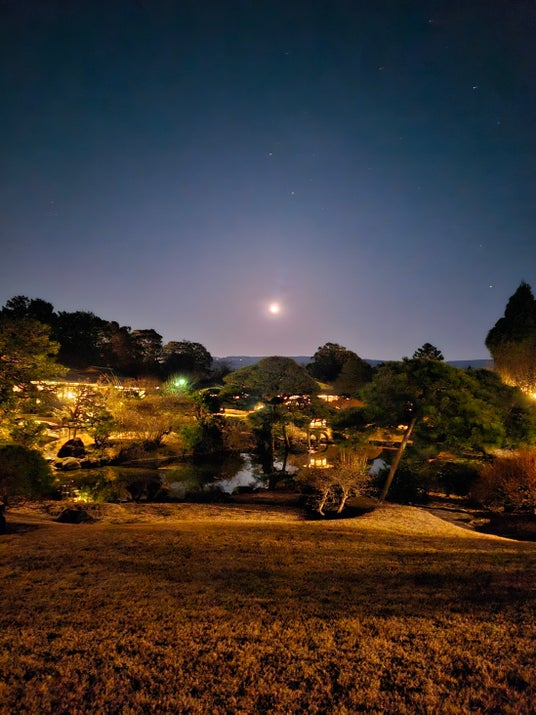 秋が深まる頃、庭園の空をゆっくりと昇る名月は、池の水面に淡い光を落とし、昼間とは異なる幻想的な景色を生み出します。その月明りと行燈の柔らかな明かりが庭園を優しく包み込み、静寂の中に虫の音が響く夜――。