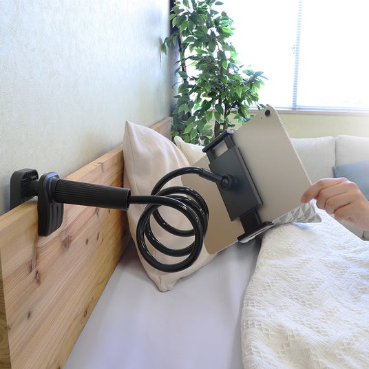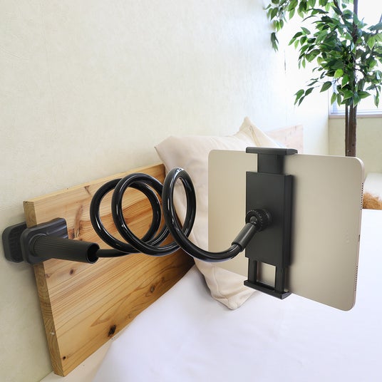 最長約110cmのロングアームにより、高い自由度での設置が可能です。また、アーム部分は硬めに設計されているため、タブレットをセットした場合もしっかりと支えます。