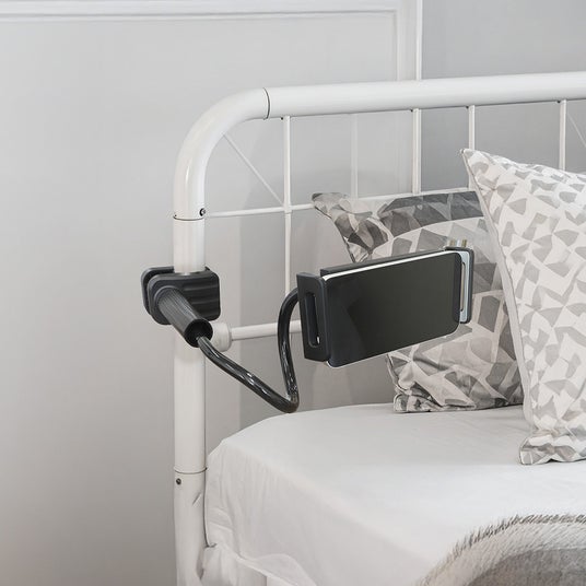 スマートフォンやタブレットを自由に固定できる本製品のホルダー部分にスマートフォンやタブレットをセットすると、ハンズフリーでスマートフォンやタブレットをお使いいただけます。撮影や動画視聴などにおすすめです。