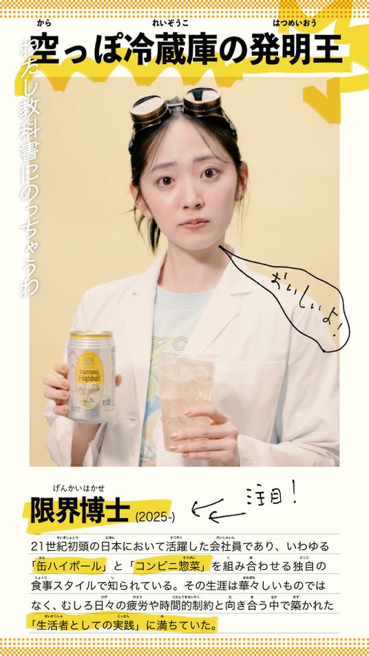 鈴木愛理さんは約2年半ぶりに、仕事が忙しい日もおうちで楽しくハイボール缶を飲んでリフレッシュする働く女性限界ちゃんを演じました。限界ちゃんは仕事帰りに、コンビニで買える美味しいご飯にアイデアを加えて、「ハイボール缶×カップ氷」とともにおうち晩酌を楽しみます。「コンビニは冷蔵庫」は本動画のために書き下ろされた限界ちゃん初のオリジナルソング。「仕事が忙しくて自炊が難しい日にも、冷蔵庫代わりに使えるコンビニで、キンキンに冷えたハイボール缶を買って、カップ氷に注ぐ」という若者のリアルなライフスタイルを軽快に描いています。