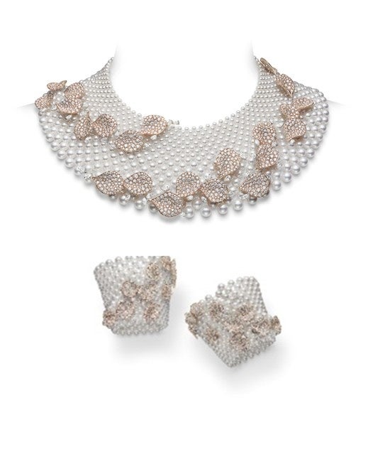 レースのように編み込まれたパールに、風の軌跡をなぞる花びらが寄り添うジュエリー。胸もとに、手もとに、優美な余韻を湛えて。
