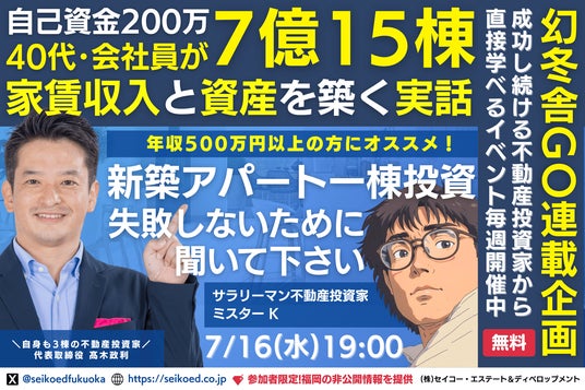 幻冬舎ゴールドオンラインに掲載されたセイコー・エステート&ディベロップメント代表高木の記事でも取り上げたサラリーマン不動産投資家ミスターKが講師で登壇する、セミナー第二段。