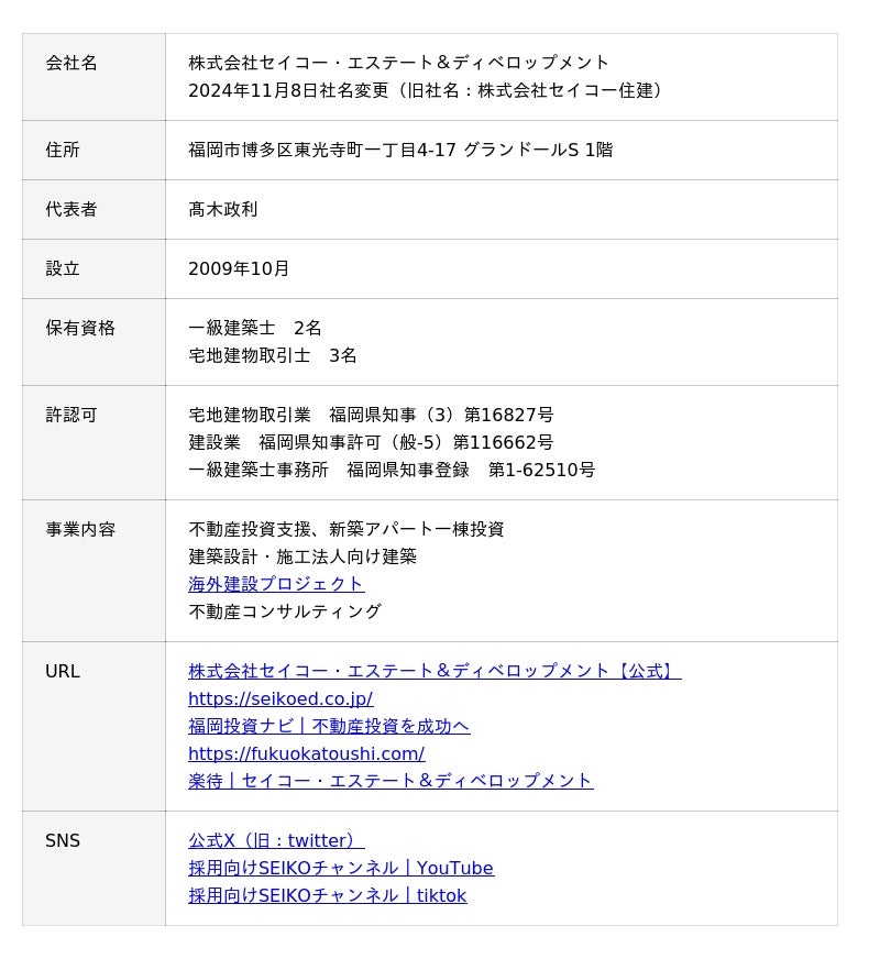 株式会社セイコー・エステート&ディベロップメントは、福岡市博多区を拠点に不動産投資支援と建築事業を展開しています。土地仕入れから融資戦略、建築プラン、施工、入居者管理までをワンストップで提供し、投資家の資産形成を伴走型で支援することを理念としています。福岡エリアでの不動産投資において、「投資家目線に立ったアパート建築会社」として、多くの投資家から高い信頼をいただいております。