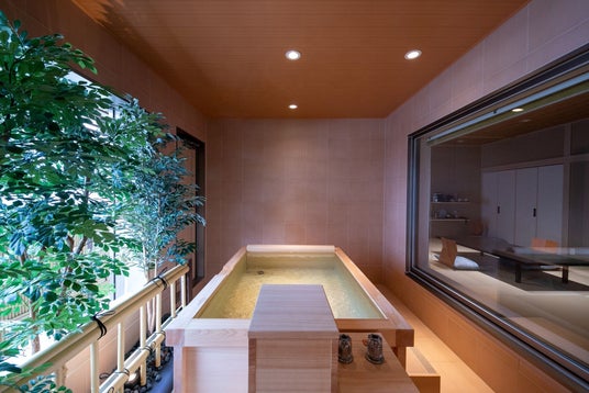 ・全室に設けられた自家源泉掛け流し温泉の室内露天風呂など館内設備