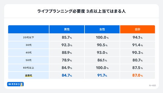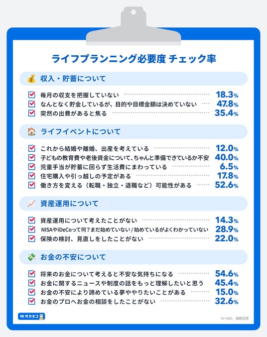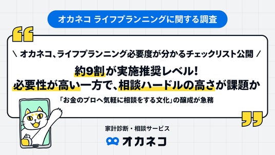 オカネコ、ライフプランニング必要度が分かるチェックリスト公開。約9割が実施推奨レベル!必要性が高い一方で、相談ハードルの高さが課題か