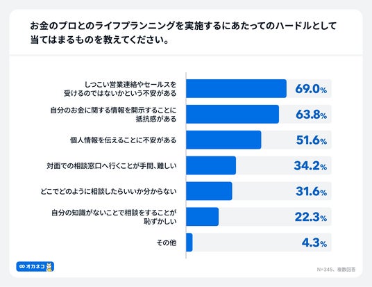 お金のプロとのライフプランニングを実施するにあたってのハードルについて具体的に質問したところ、回答の多かったものから順に、「しつこい営業連絡やセールスを受けるのではないかという不安がある」69.0%、「自分のお金に関する情報を開示することに抵抗感がある」63.8%、「個人情報を伝えることに不安がある」51.6%、「対面での相談窓口へ行くことが手間、難しい」34.2%、「どこでどのように相談したらいいか分からない」31.6%、「自分の知識がないことで相談をすることが恥ずかしい」22.3%という結果になりました。